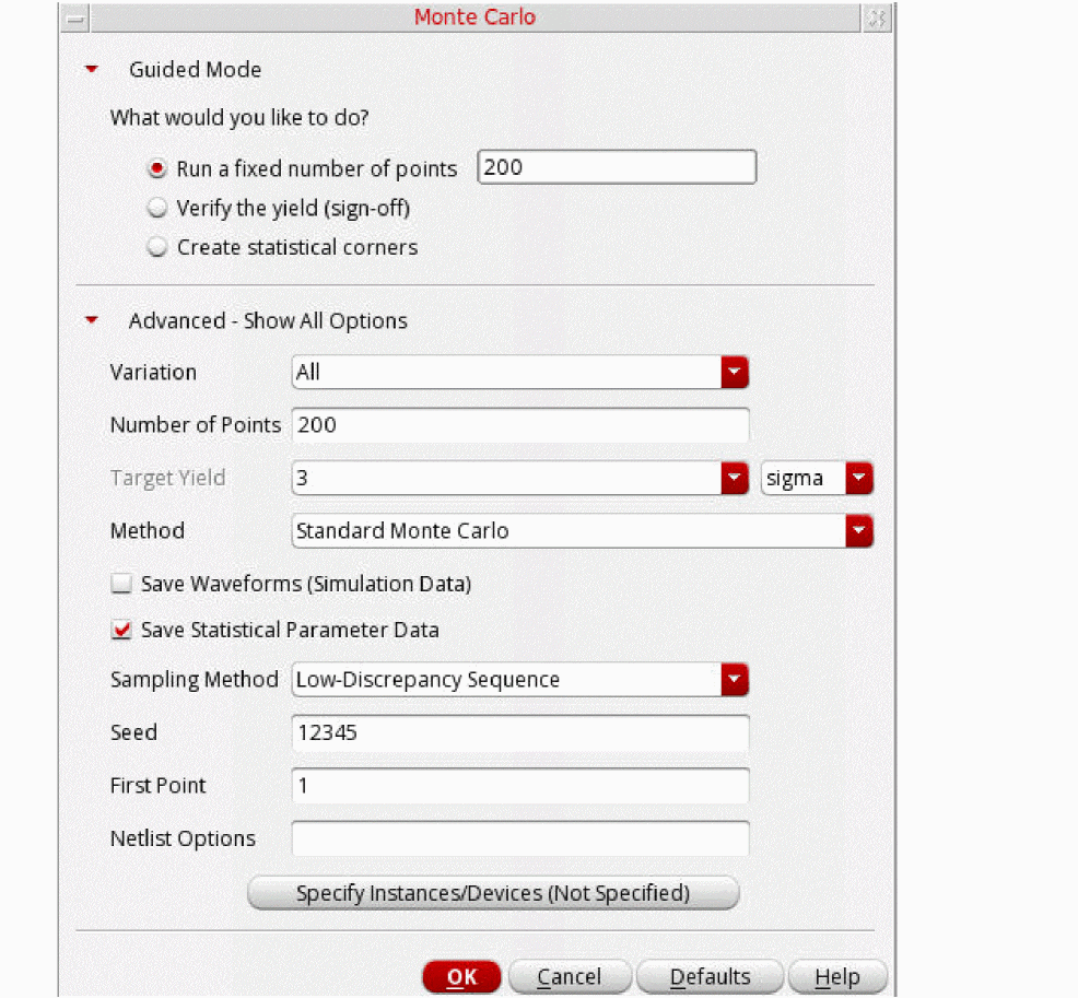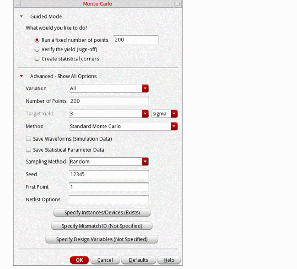 For details about the various options that can be set on this form for a standard Monte Carlo run, refer to Performing a Standard Monte Carlo Run section in the Virtuoso ADE Explorer User Guide.