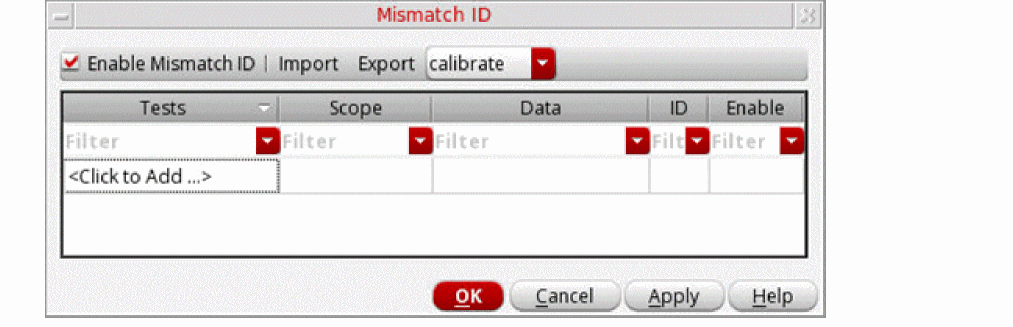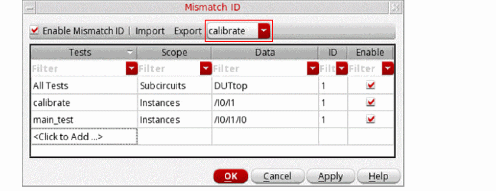 The Mismatch ID form lets you specify mismatch IDs for the instances and subcircuits so that the values of statistical parameters generated for those instances or subcircuits remains same across all tests.