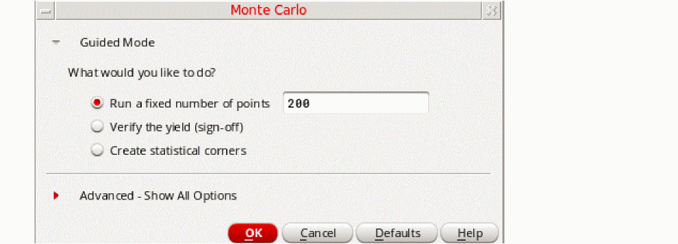 Random, for every subsequent Monte Carlo run, specify an incremented value in the Starting Run Number field. For example, if you run the first Monte Carlo run for 20 points, in the subsequent run, set the Starting Run Number field on the Monte Carlo form to21. Similarly, the value in the Number of Points field can vary across different Monte Carlo runs. For example, if you run the first Monte Carlo run for 20 points, for the second one, you can set the Number of Points field to 40. -