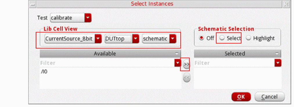 An additional point to note about this form in ADE Assembler is that ifAll Testsis selected in the Tests drop-down list, you can add only instances of cellviews that exist in the designs for all the tests. If instances of a cellview do not exist in the designs for all the tests, the View field displays the textNo Common Viewindicating that you cannot select instances of the cellview.By default, the Type and Sch/Master/Subcircuit columns are not visible in the table that lists the selected instances. To view these columns, right-click the title bar and select the name of the column to be displayed in this table.Also see:
