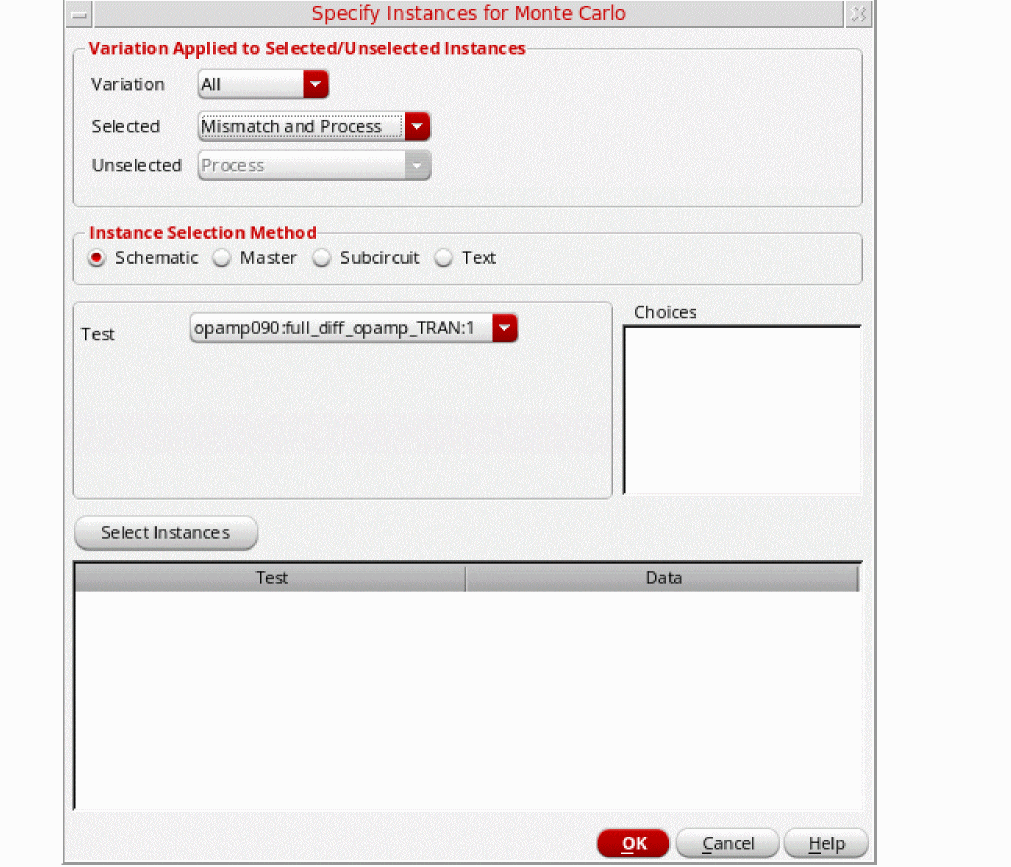 By default, variation is applied to all subcircuit instances in the design. You can use the Specify Instances for Mismatch form to do one of the following:- Select specific instances to which variation must be applied. The variation is also applied to all subcircuits instantiated under the selected instances.