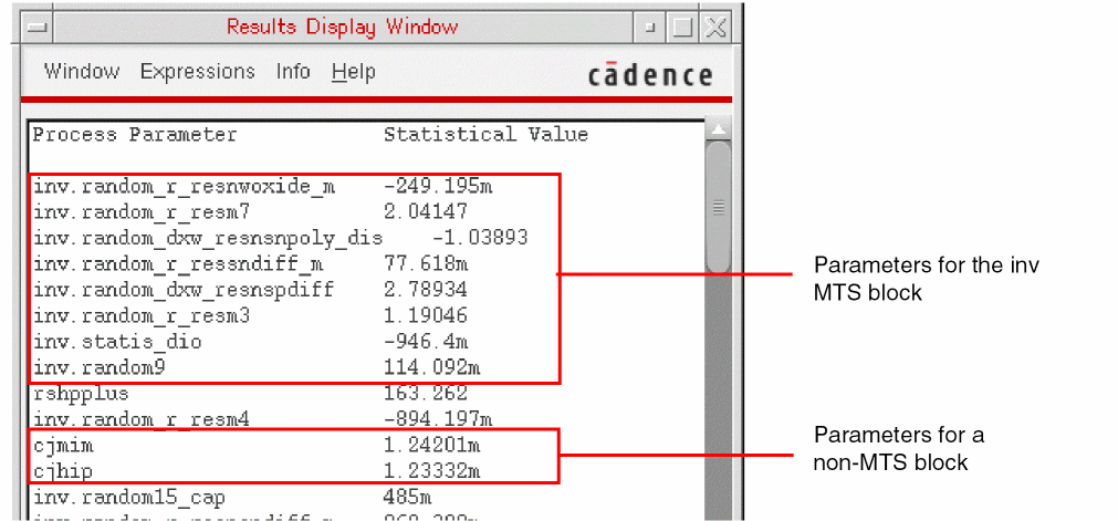The Results Display Window shows a list of all the process and statistical parameters along with the statistical value used for simulation. The names of parameters for the MTS blocks are prefixed with the name of their corresponding block. For example, in the following figure, the names of parameters for the inv MTS block are prefixed with inv.