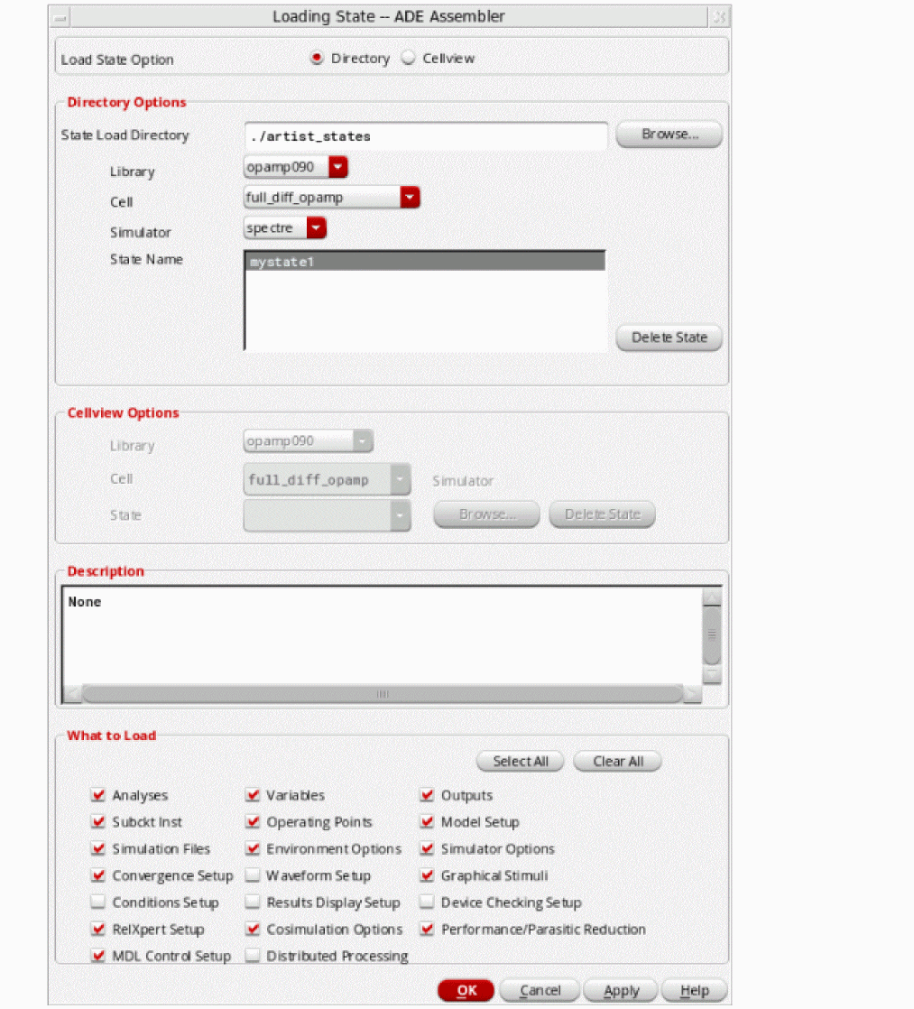 - Depending on how the state was saved in ADE L, select Directory or Cellview radio button for Load State Option.