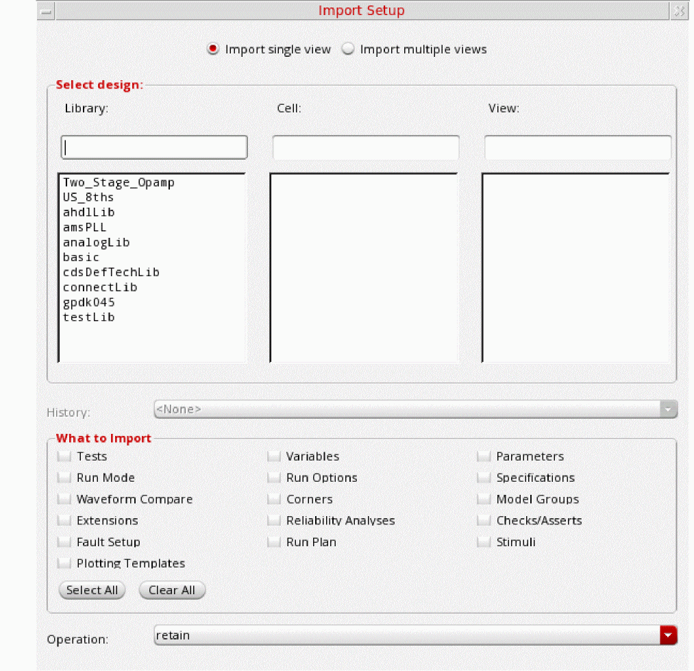 You can use this form to import setup from one or more ADE XL or ADE Assembler cellviews. Select appropriate options on this form to specify the names of cellviews and the settings to be imported.