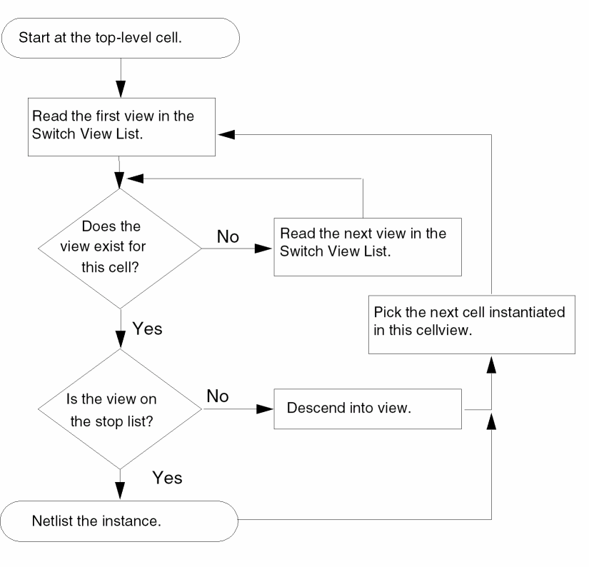 The following flowchart shows how a typical OSS-based netlister netlists a design.