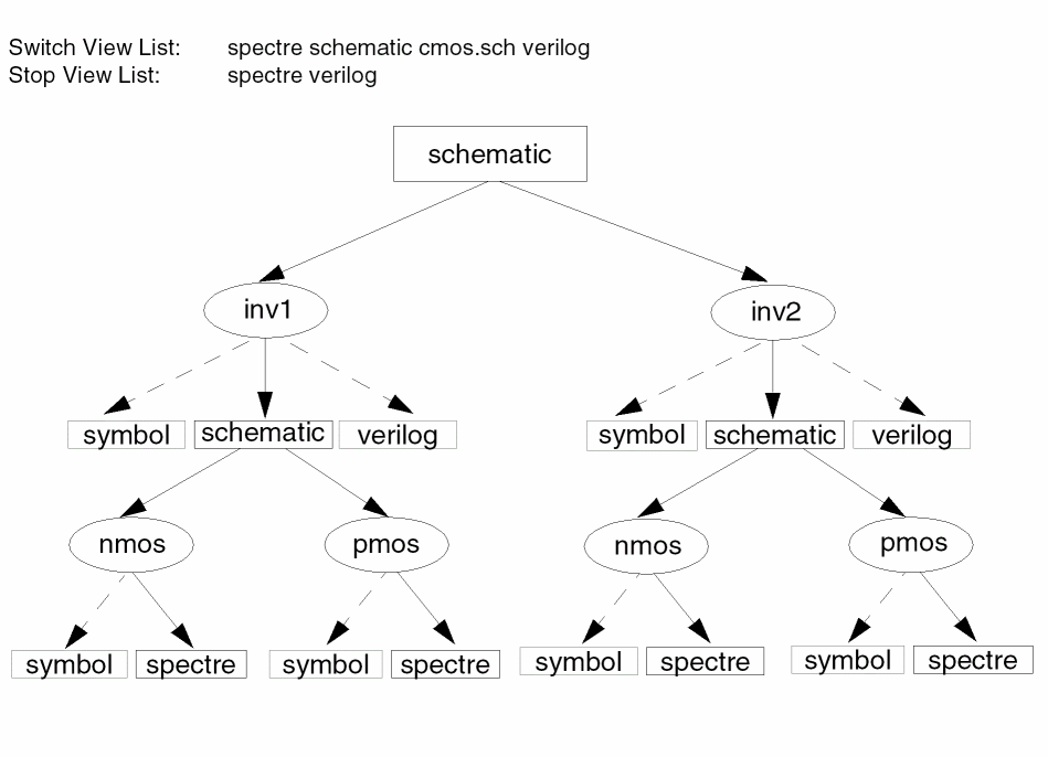 The following figure illustrates how hierarchy expansion is performed on a simple design. The solid lines show the view selection and design expansion based on the switch view list and stop view list shown.