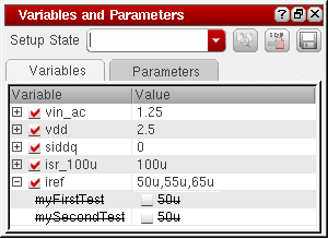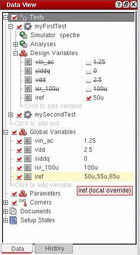 For example, the following figure indicates that the values45u,50uand55uspecified for global variableirefwill be swept over the tests namedmyFirstTest and mySecondTest. In this example, themyFirstTestandmySecondTesttests have a design variable namedirefwith the value50u. The test names and values are displayed with a strikethrough because the global variableirefoverrides the design variableiref.