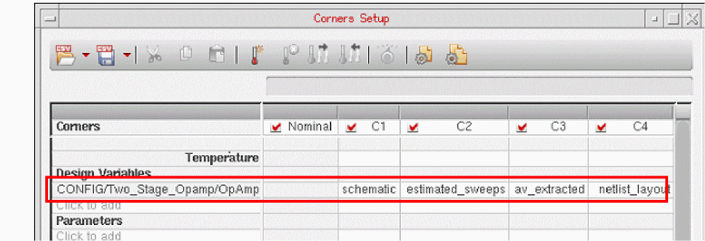 You can parameterize your cellview by using config sweep variables in the Corners Setup form. To create a config sweep variable in the corners, perform the following steps: