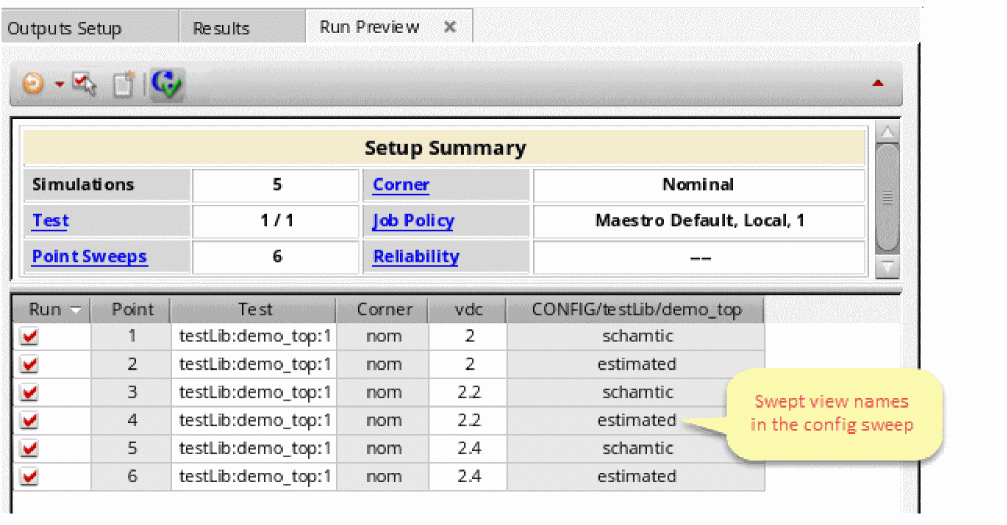 If config sweep variables are added to the setup, the Run Preview tab for the Single Run, Sweeps and Corners run mode shows the swept values in a column for the corresponding global variable, as shown below.