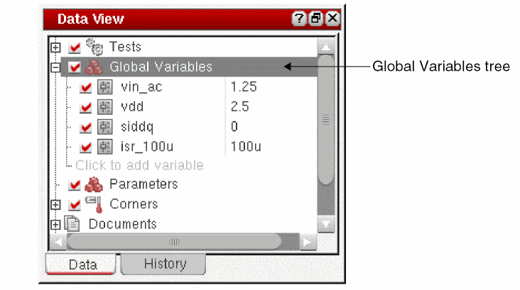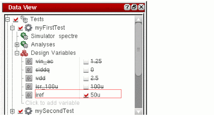 When a global variable is disabled, its value will not be used for simulation but its definition is retained in the Global Variables tree on the Data View pane and the Variables tab of the Variables and Parameters pane. The value of the design variable (specified for a test) that has the same name as the global variable will be used for the simulation. The strikethrough no longer appears for the design variable value in the test tree. For example, in the following figure, the value of design variablevin_acspecified for the tests namedmyFirstTestandmySecondTestwill be used because the global variablevin_acis disabled.