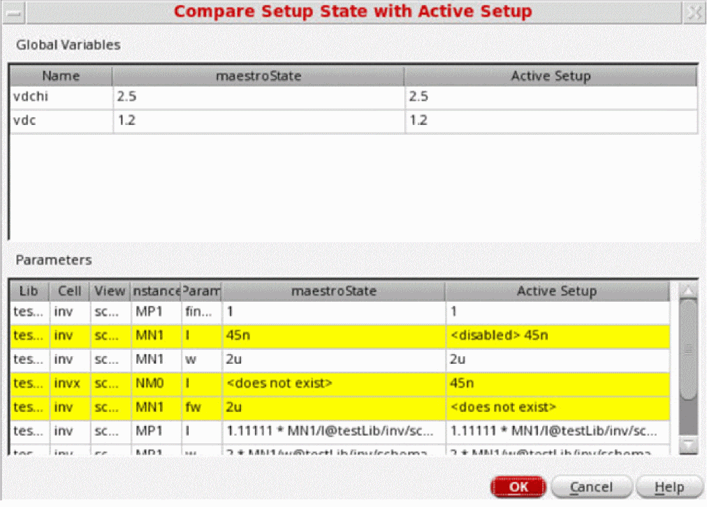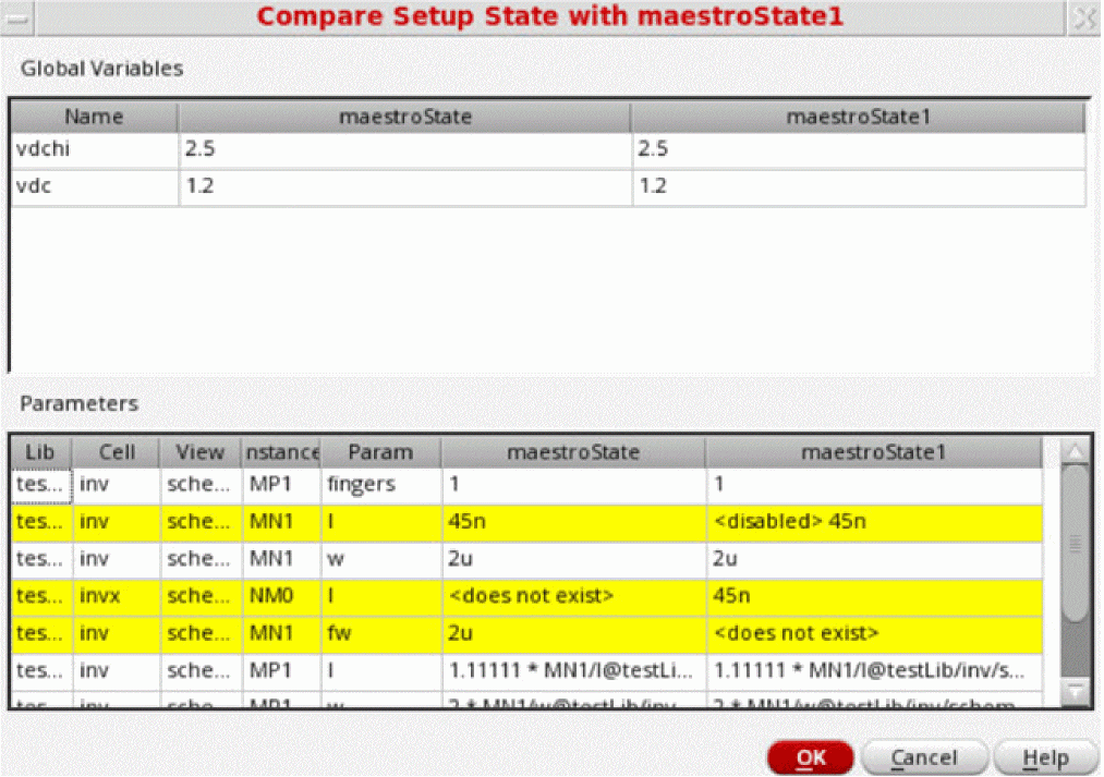 Before loading the global variables from a saved state, you can also choose to compare the variables and parameters with the currently active state or another setup state.