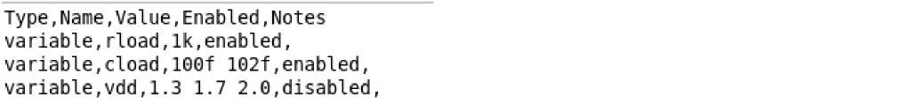 All the global variables, their values, notes, and the enabled or disabled status currently defined in the active setup are saved in the specified CSV file in a standard format, as shown in the example below.