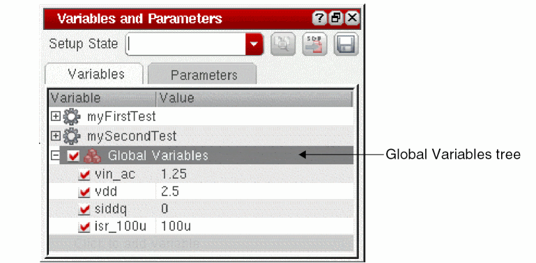 Global variables are the variables defined globally in the ADE Assembler setup. Being global, these variables can be used by all the tests if you need to use a common value in all or multiple tests. Another benefit is that you can override the design variable values to be used in test simulations without modifying the value in the test itself. The simulator will use the value you specified and not the value from the schematic.