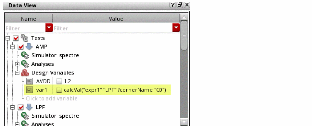 Note that the calcVal expression is being added to the design variable for test AMP, whereas the output used in calcVal is for test LPF. To perform this calculation, ADE Assembler first runs simulation for test LPF and then calculates the value for var1 in test AMP.