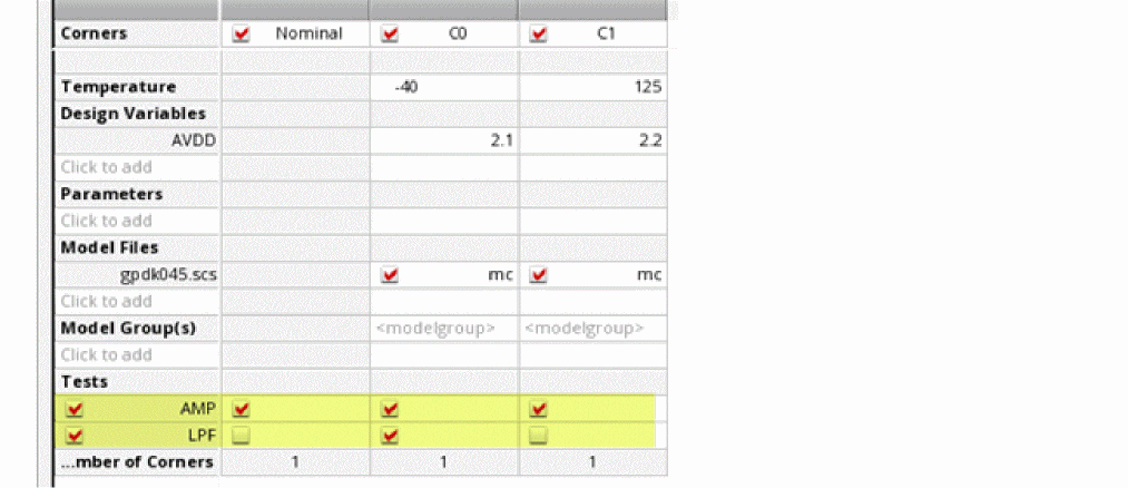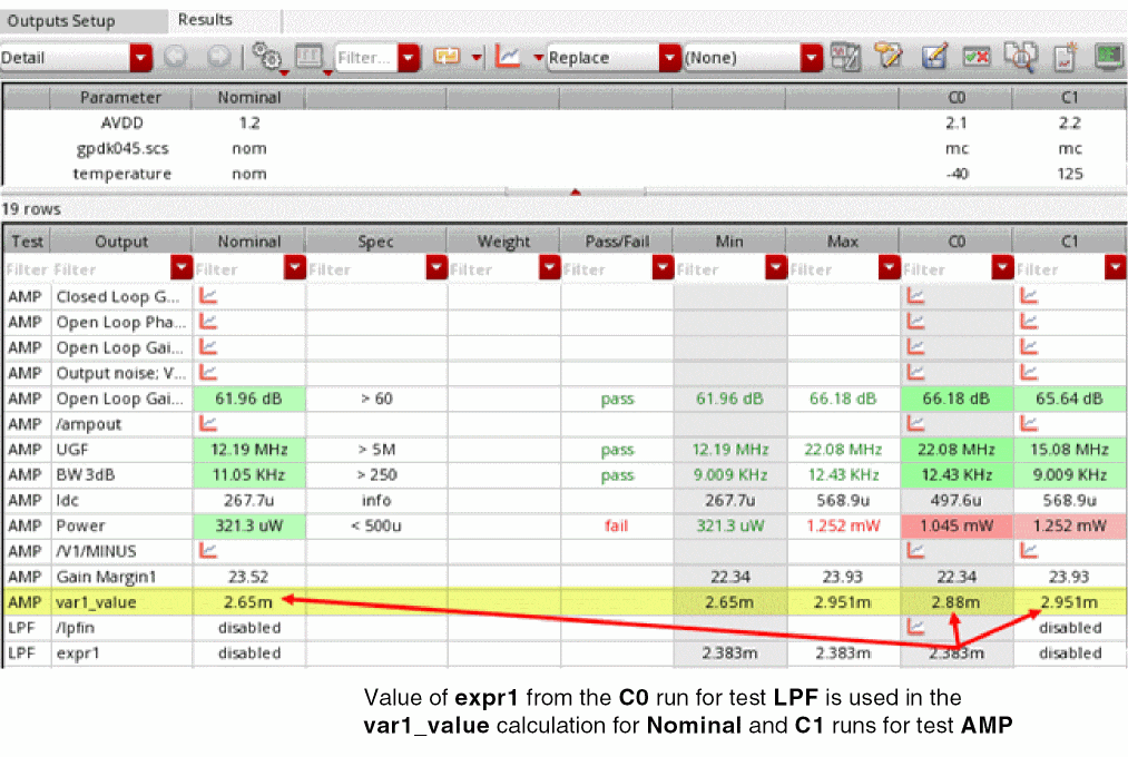 When the setup is using corners that are enabled for all tests, in the example shown above, the output value for each corner run for test LPF is used for the corresponding corner run for test AMP. That is the calibrated value for corners are used as shown below.