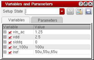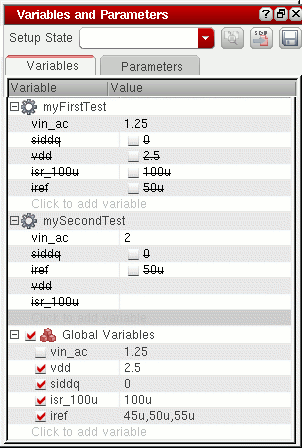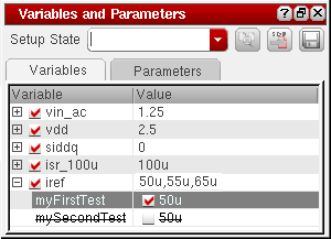 The global variable is disabled for the test. For example, in the following figure, the global variableirefis disabled for the test namedmyFirstTest. Because of this, the value50uwill be used for the test during simulation. The global variable will be swept only for the test namedmySecondTest.