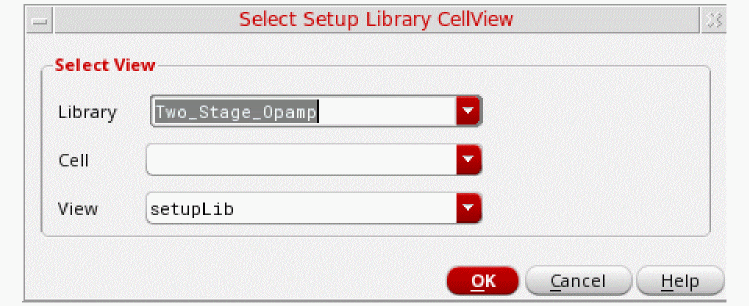 setupLibare displayed. Specify a cellview name for the Setup Library view if you want to create a new cellview. By default, the cellview type is displayed assetupLibwhen you open the form. If you want to load an existing cellview, select the cellview name from the drop-down list. - Click OK.