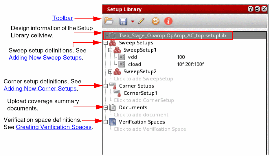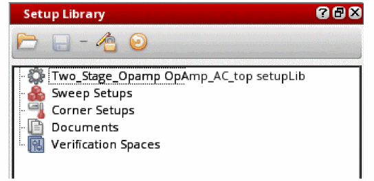 The Setup Library assistant helps you define a project-specific (master) setup for the design blocks in ADE Assembler and then reuse the specified setup to create or modify the current simulation setup in the Data View assistant. The setup in this assistant is generic and can be applied on any design. The Setup Library assistant can be accessed using ADE Assembler and ADE Verifier.