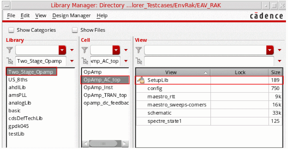 The new Setup Library cellview you create is saved and displayed in the View section of Library Manager. For example, if you create a new cellview SetupLib for library Two_Stage_Opamp and cell OpAmp_AC_top, this cellview is displayed in the Library Manager window, as shown in the figure below: