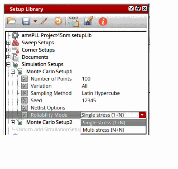 Alternatively, you can drag the top element of reliability analyses together with one or more reliability options from Data View in ADE Assembler and drop them to any reliability setup or reliability options node in the setup library cellview.