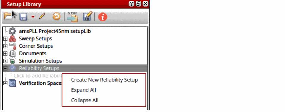 To add a new reliability setup, ensure that the setup library cellview is editable and do one of the following: