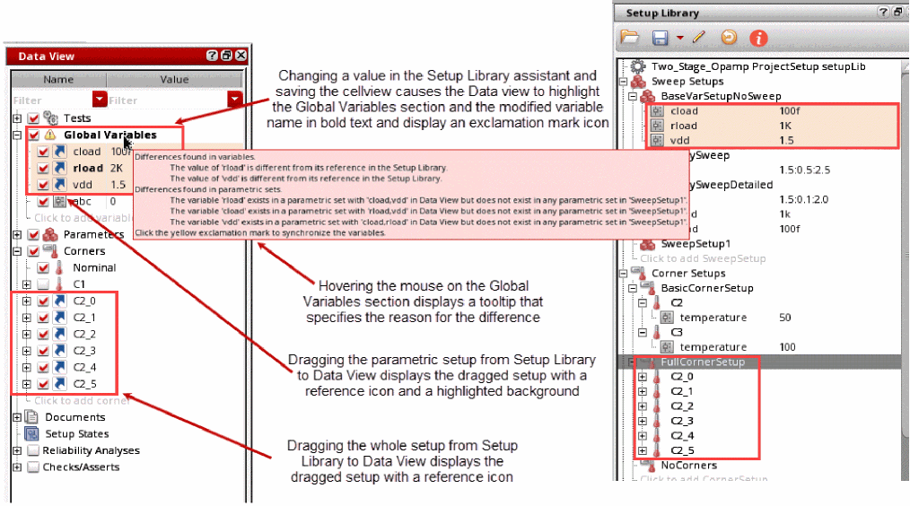Additionally, an exclamation mark icon is also displayed with the Global Variables section, indicating that the variables are not in sync with the Setup Library. When you move your mouse over the section name, a tooltip is displayed to specify the reason for the difference. When you hover the pointer on sweeps and corners in Data View, a tooltip appears to display the name of the referenced setup from Setup Library.