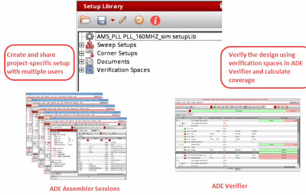 In ADE Verifier, you can open the Setup Library assistant, load a predefined Setup Library cellview, create verification spaces, and then assign these spaces to different blocks. You can then calculate the coverage percentage and generate a coverage report to check whether the specified setup values in verification spaces are run or not.