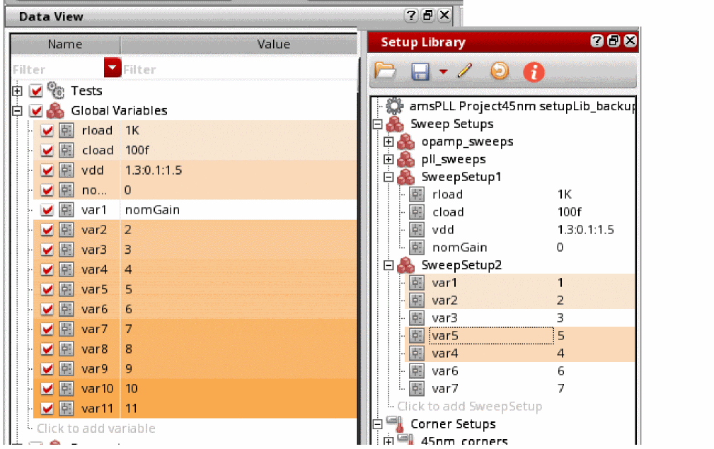 To do this, you can drag the setup elements from the Setup Library assistant to the Data View assistant. You can drag either a particular sweep or corner value or the entire sweep or corner setups. To drag multiple setup elements, use the Ctrl key.