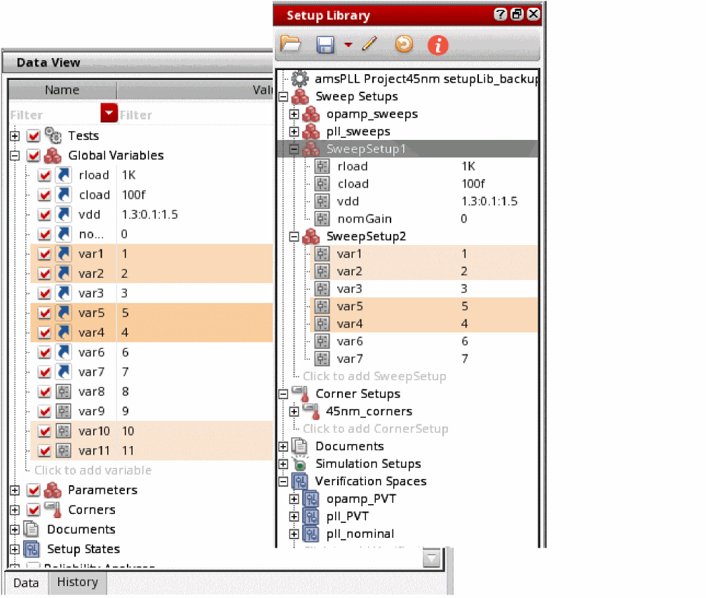 If the sweep or corner setup and reliability setup that you reused from the Setup Library assistant is updated in the project-specific setup in Setup Library, the Data View assistant displays the Global Variables section name and variable name, and the Reliability Analyses and reliability elements in bold text.