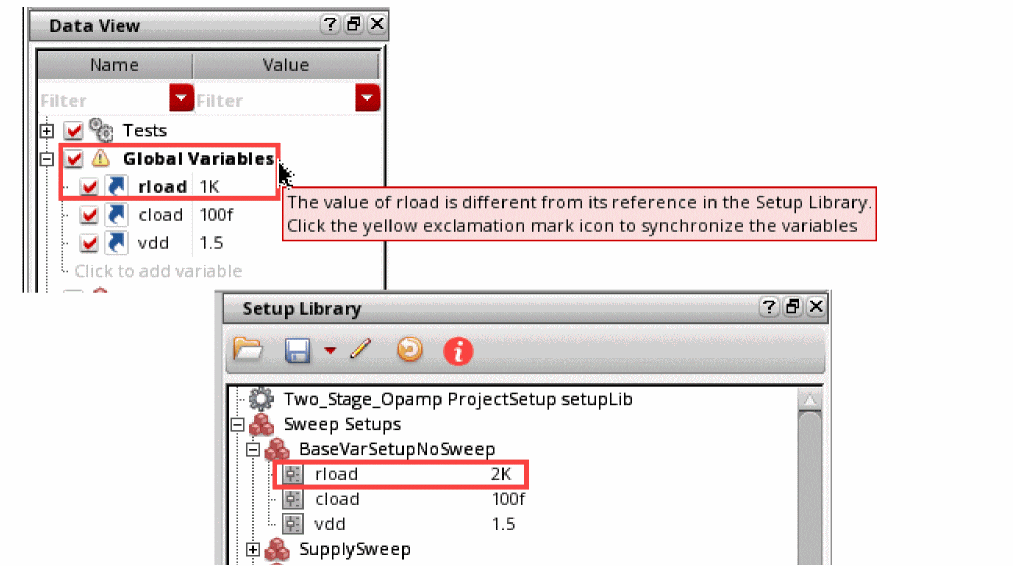 All variables in the dragged setup are displayed with a reference icon and the variables in the parametric setup are displayed with a highlighted background. If a difference exists in the parametric sets between Global Variables in the Data View and referenced sweep setups in the Setup Library assistant, the Global Variables section and the variable name with the difference is displayed in bold text with an exclamation icon. Additionally, a tooltip displays the differences.