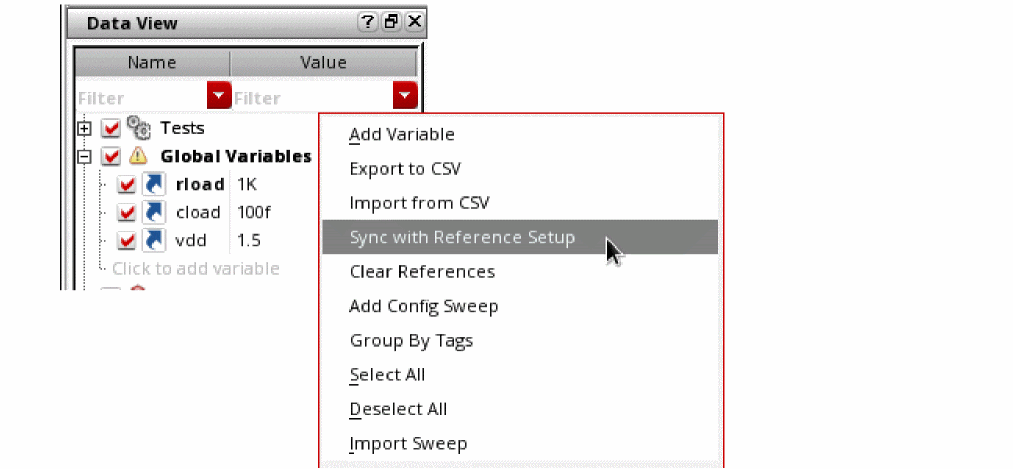 Right-click the Global Variables, Corners, or Reliability Analyses section and choose Sync with Reference Setup.