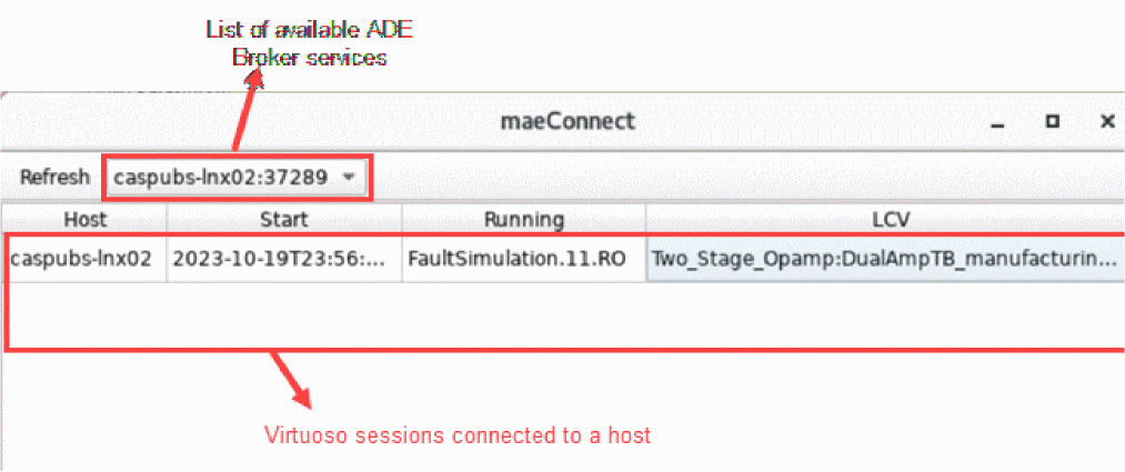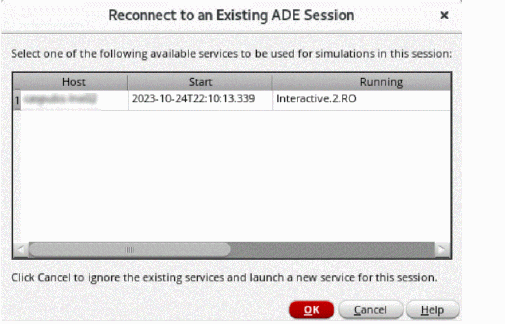 When you reopen the maestro cellview, if the simulation is in progress, Virtuoso displays the Reconnect to an Existing ADE Session form that shows a list of all services available for the cellview.