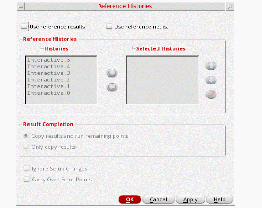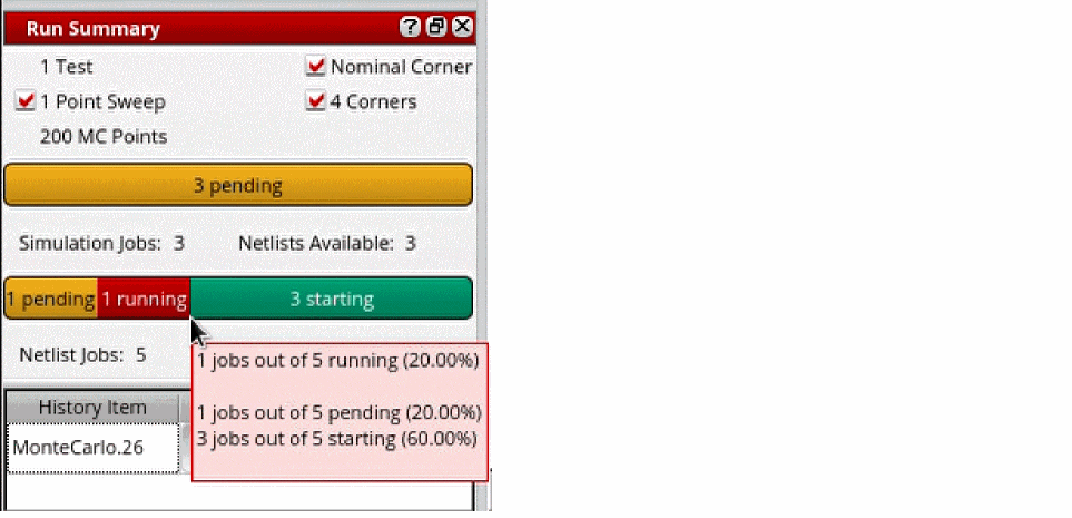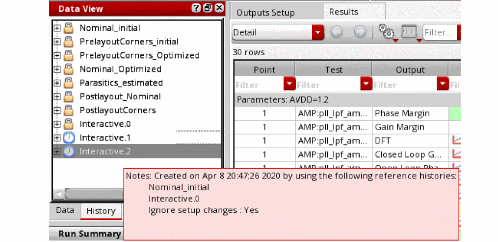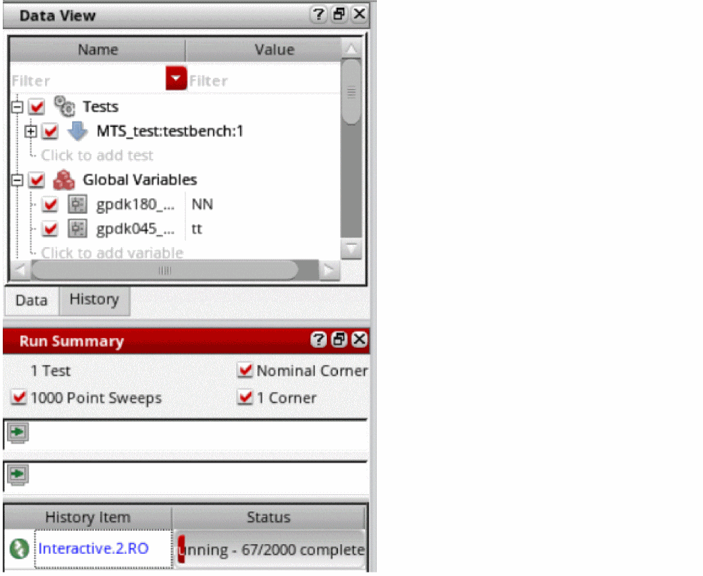 Also note that the history name has a .RO suffix, which indicates that for simulations that use Simulation Manager, the results are saved in read-only histories. These histories are also locked to avoid any accidental modification in another maestro cellview. After the simulation run is complete, the read-only status is removed form the history and it is unlocked.