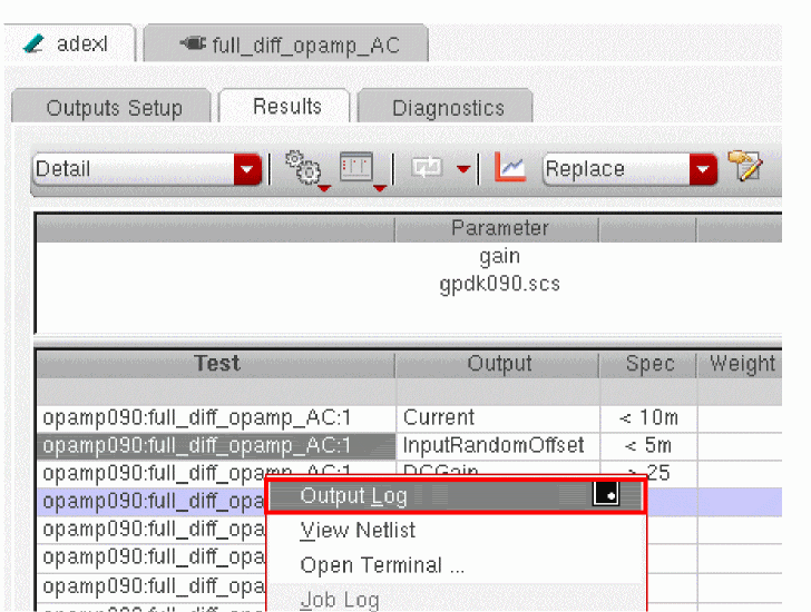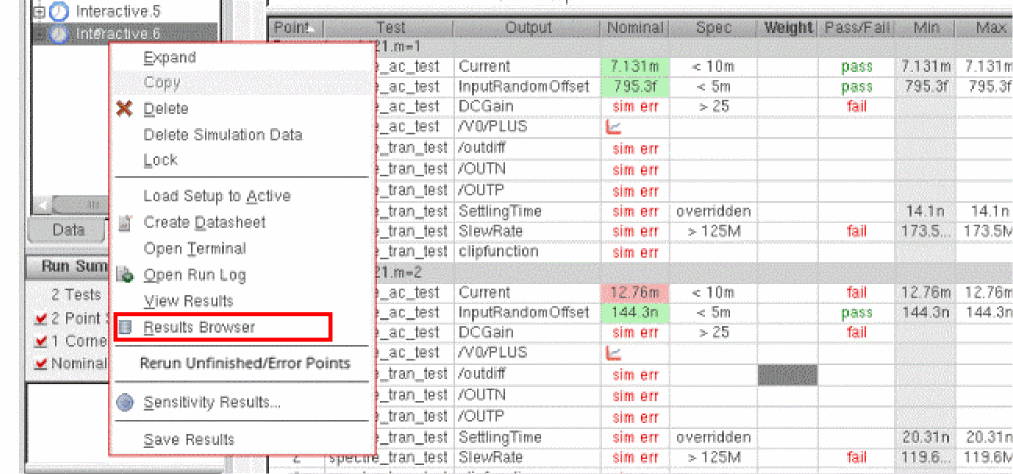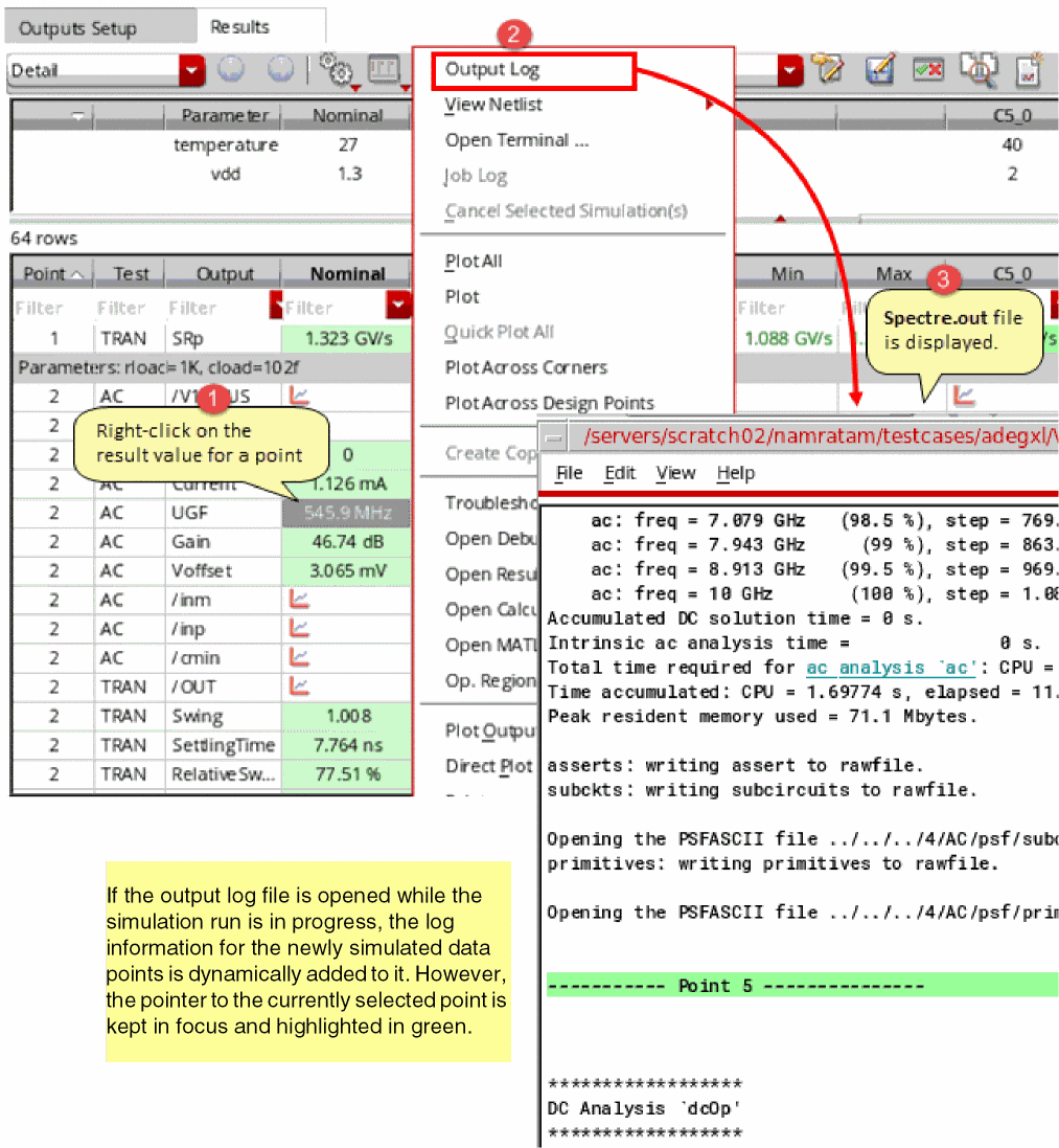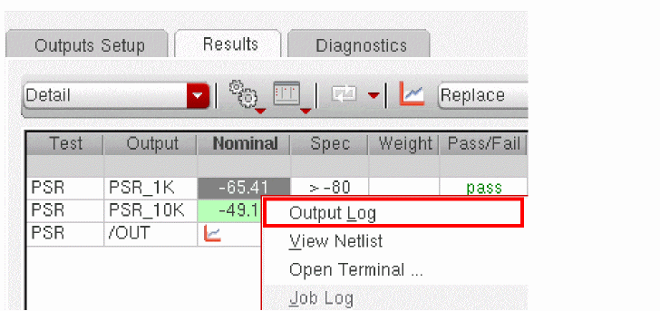 The results of simulations run from OCEAN scripts are saved in the results database of the maestro view. While the OCEAN XL simulations are in progress or after they are complete, you can view these results in the ADE Assembler user interface.