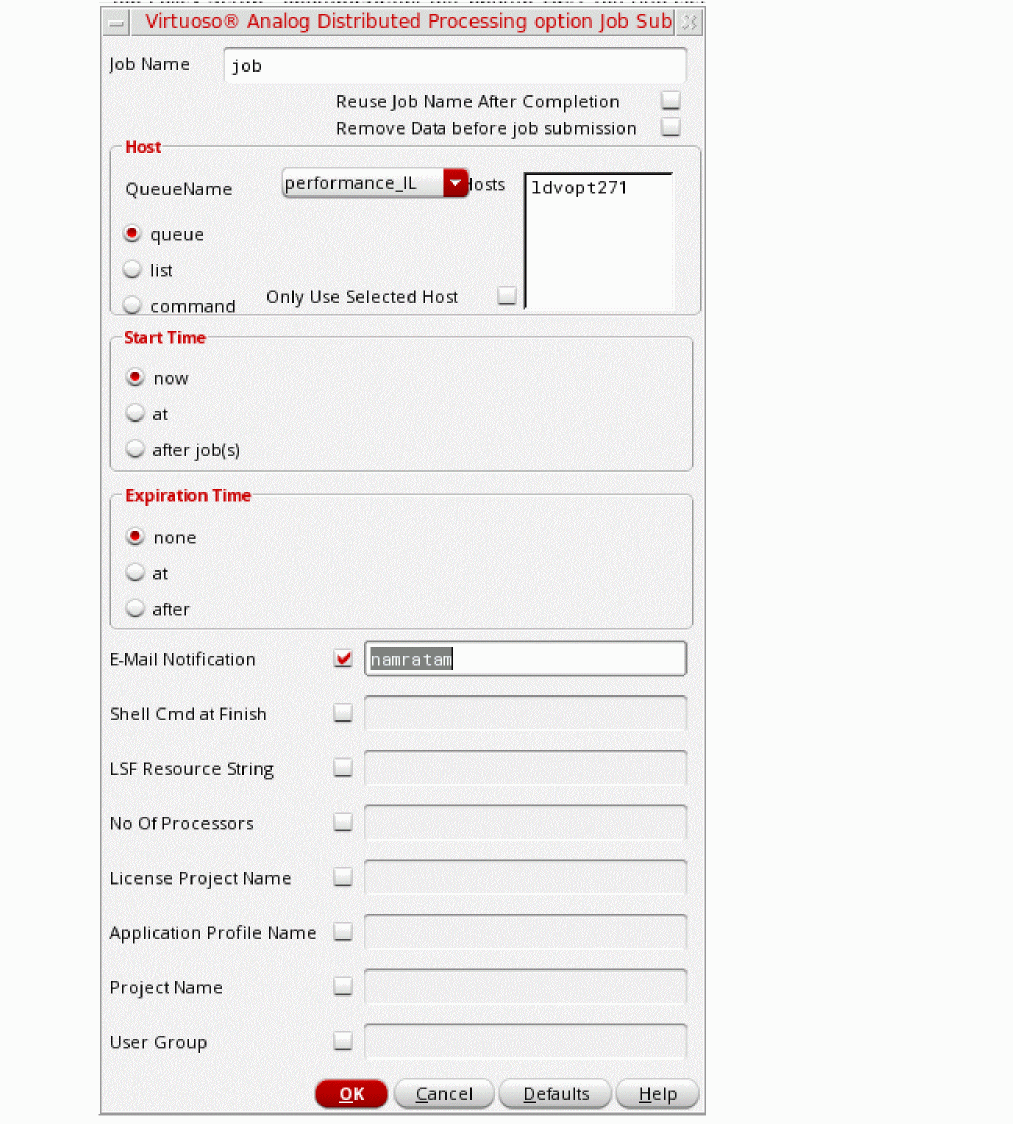 When you run a simulation, Virtuoso Studio uses the Simulation Manager Default job policy to start a Simulation Manager service. You can customize the default job policy to use an LSF command to run this service on a remote host. Alternatively, you can use another job policy by setting the simulationServiceJobPolicy environment variable.