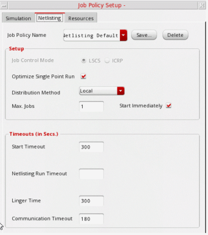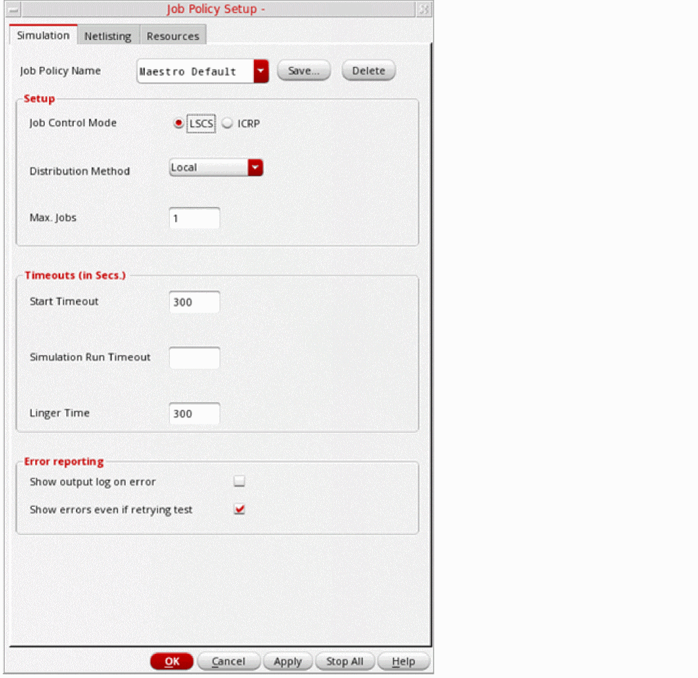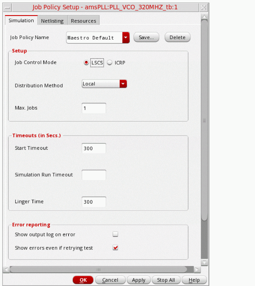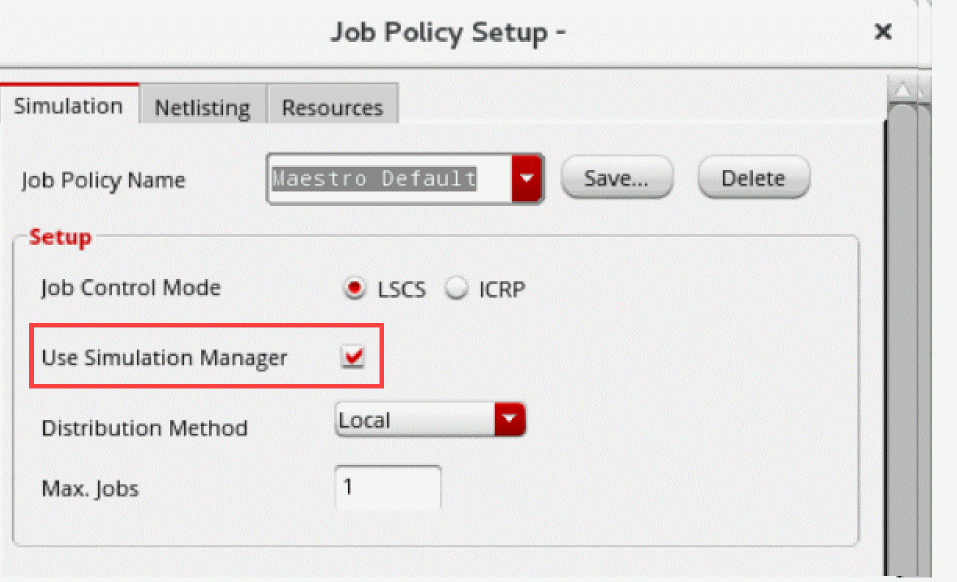 When you start a simulation run, Virtuoso launches a local or remote Simulation Manager service as per the specified job policy. Simulation Manager Default is the default job policy used for Simulation Manager. You can customize its settings or use another job policy by setting the simulationServiceJobPolicy environment variable.