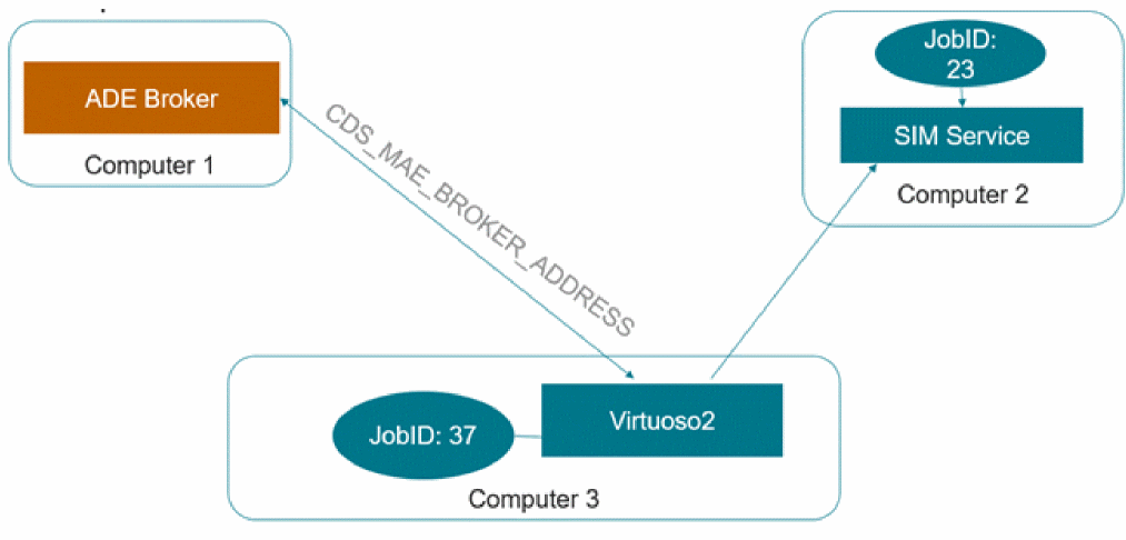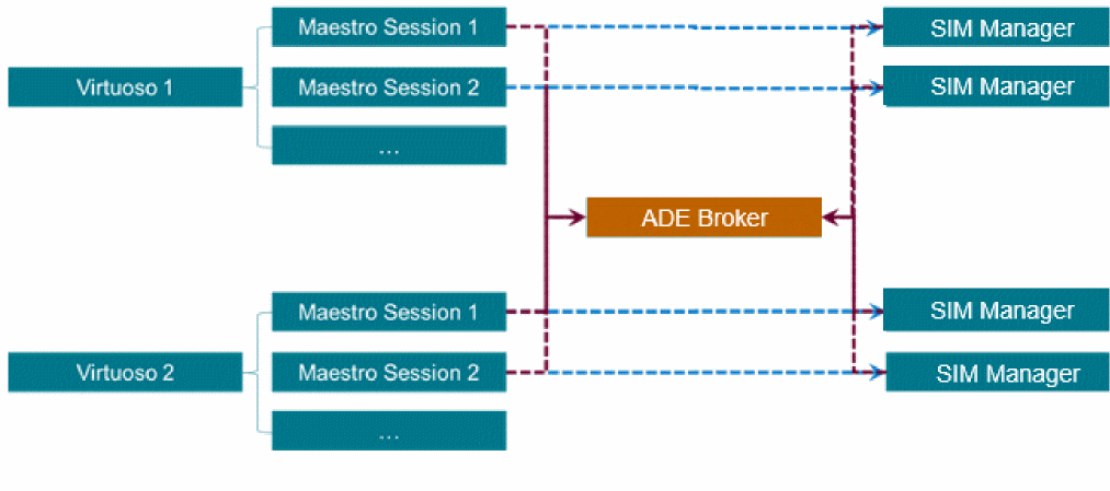 This infrastructure is supported by a centralized ADE broker service that keeps a log of simulation manager services for all Virtuoso sessions and maestro cellviews running on a computer. The following diagram describes the architecture that uses this broker service.