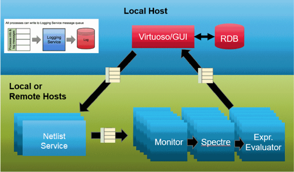 The following diagram shows how the ADE simulation management tasks are offloaded from the ADE Assembler user interface. The simulation management service manages all netlisting and simulation jobs keeping the ADE Assembler UI available for other tasks.