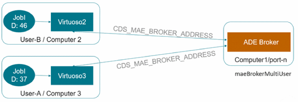 A multi-user environment lets multiple Virtuoso sessions started by multiple users on different hosts to connect to a common ADE broker.