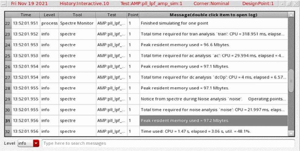 For example:1/1 completed. *Info* The result of this OCEAN XL run are saved in "Interactive.3" in library "rfExamples", cell "ne600", view "adexl".