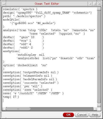 The OCEAN Test Editor form appears.The OCEAN Test Editor form is a text editor that displays the OCEAN commands saved in a script.