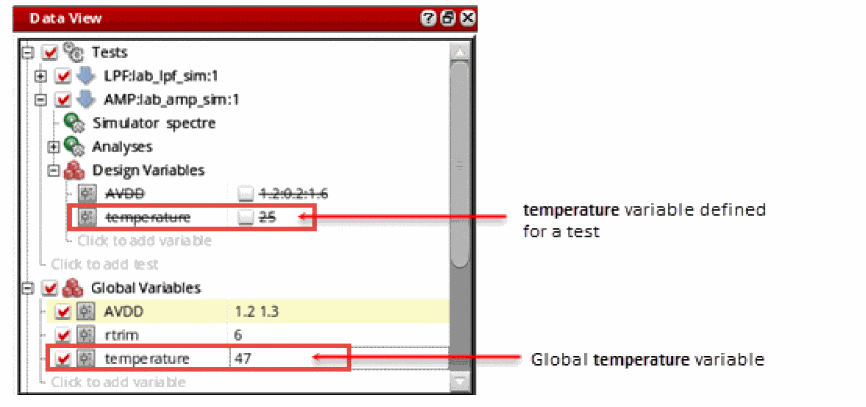 However, if you set the autoSyncGlobalVarsToTestVars environment variable tot, the global variables are also taken to the ADE Explorer setup when you open a test for editing. If you change a design variable in ADE Explorer and then go to ADE Assembler, only the local value of design variable for that test is updated. While changing a variable value in ADE Explorer, the value of corresponding global variable is not updated; however, a yellow highlight appears on that global variable indicating that it has been overridden by the test-specific local value. -
