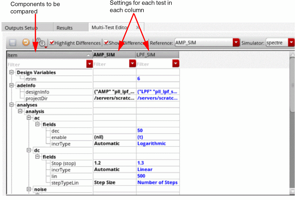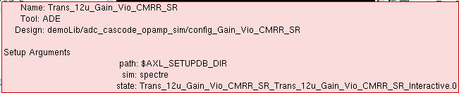 - The first item, adeInfo, displays the design information, including the library, cell, view, simulator, and the path to the project directory. This item lets you to compare the design and simulator for each test.