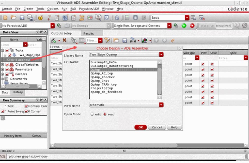 Observe the following:- A new test is created and opened in Virtuoso ADE Explorer, which is more suitable to work on a single test. You can set up the test details and switch to Virtuoso ADE Assembler. The newly created test is added to the Tests tree in the Data View assistant pane.