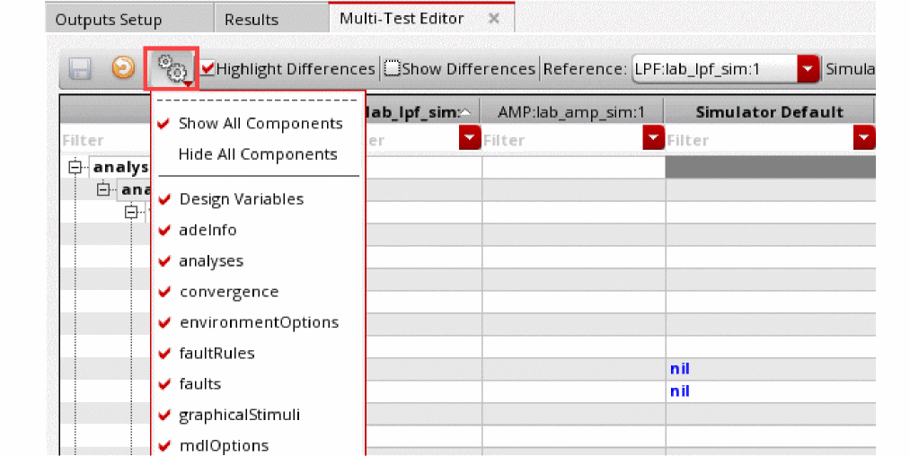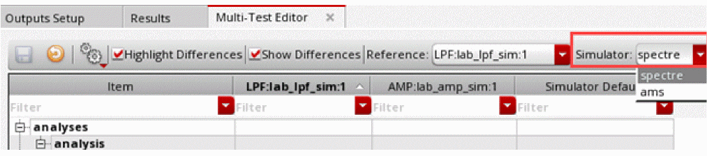 By default, the tests that use the simulator same as that of the reference test are shown in the table. If the maestro view contains tests that use a different simulator, choose another simulator name from the Simulator drop-down list on the toolbar of the Multi-Test Editor tab to view the tests with use the selected simulator. Columns for other tests are hidden.