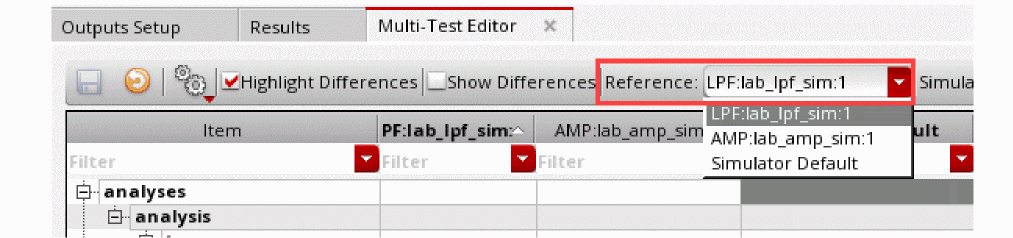 By default, the first column in the Tests tree in the Data View assistant is used as the reference test. You can change the reference test by selecting any other test name from the Reference drop-down list in the toolbar on the Multi-Test Editor tab.