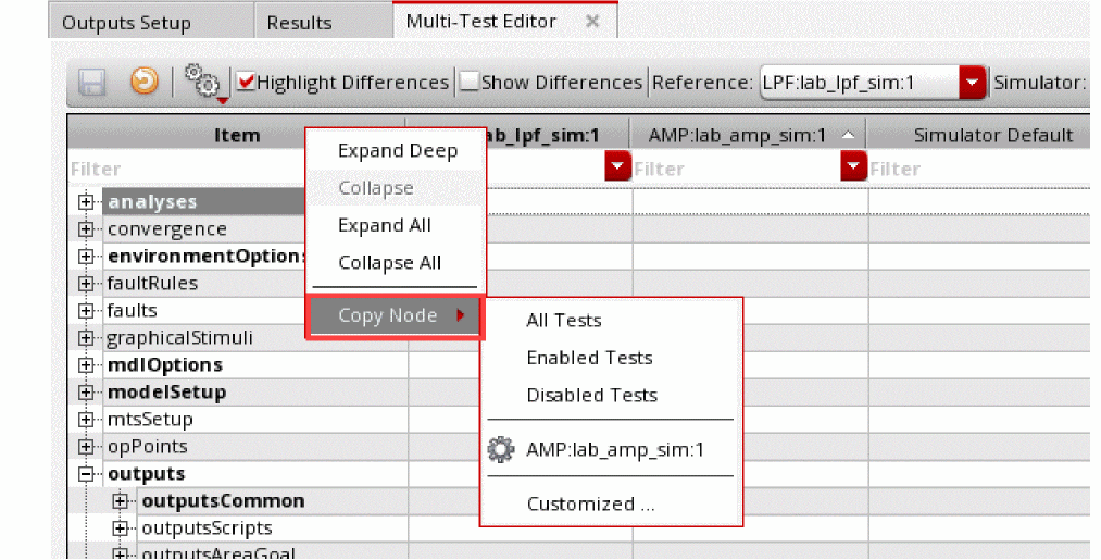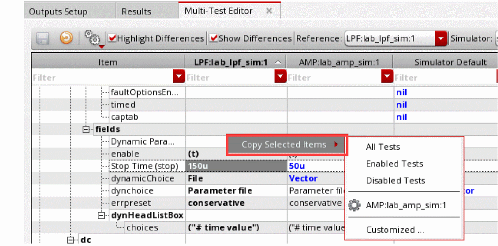One or more tests to be compared (columns for other tests placed to the right of the reference test): These are the columns to be compared with the reference test, or with other tests. By default, all enabled tests from the current maestro view and with simulator same as that of the reference test are shown in the multi-test editor. Their settings from the active setup are also loaded