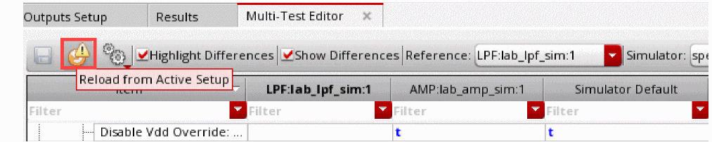 After opening the Multi-Test Editor, if you make any change, such as a change in the test name, project directory or an analysis setting in the active setup, ADE Assembler shows a warning sign on the Reload from Active Setup command on the toolbar of the Multi-Test Editor.