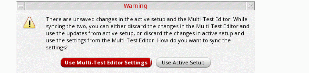 In the warning message, click an appropriate button to specify whether you want to revert to the active setup or you want to save the changes in Multi-Test Editor.