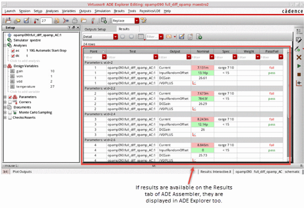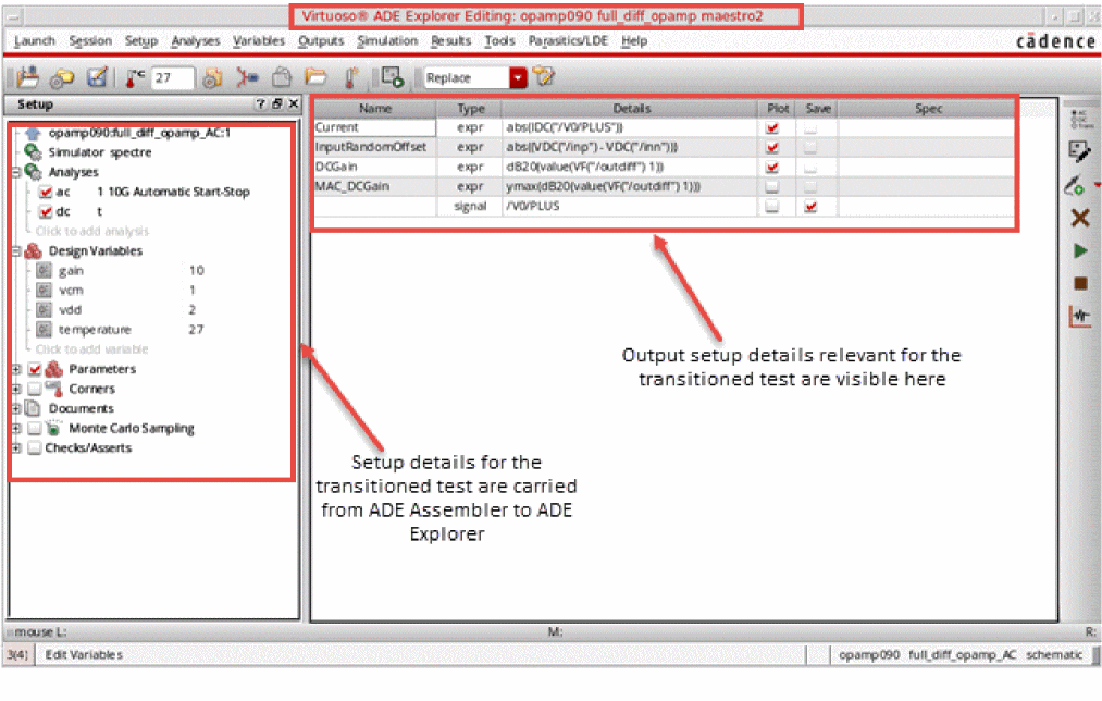 maestro.cdsenvtotto automatically promote all the design variables as global variables. - If a local design variable for the test contains sweep values in the Data View assistant of ADE Assembler, the sweep set is taken to ADE Explorer. Simulations run from ADE Explorer also use the swept values. If you make any changes in the sweep set, they are copied back to the test setup in ADE Assembler.